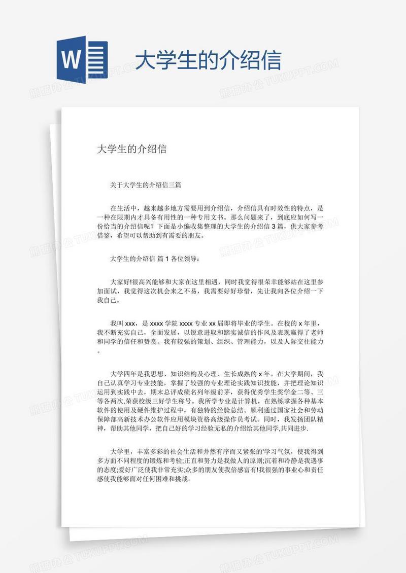 本作品为大学生的介绍信, 编号:016q72b829, 格式为 docx, 大小1 MB, 本作品下载后,先解压,解压之后用推荐软件 Word(2010) 打开, 然后进行编辑功能。