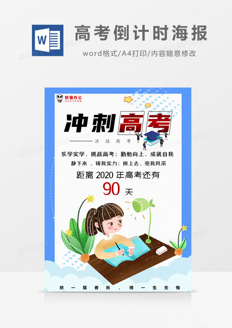本作品为蓝色卡通冲刺高考高考倒计时海报Word模板, 编号:016q7e6be9, 格式为 docx, 大小5 MB, 本作品下载后,先解压,解压之后用推荐软件 Word(2016) 打开, 然后进行编辑功能。