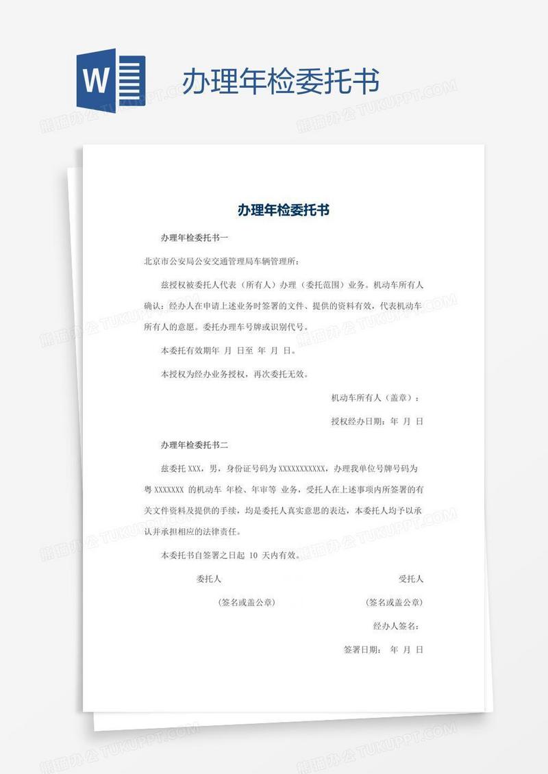 本作品为办理年检委托书, 编号:016q7l0rm9, 格式为 docx, 大小1 MB, 本作品下载后,先解压,解压之后用推荐软件 Word(2010) 打开, 然后进行编辑功能。