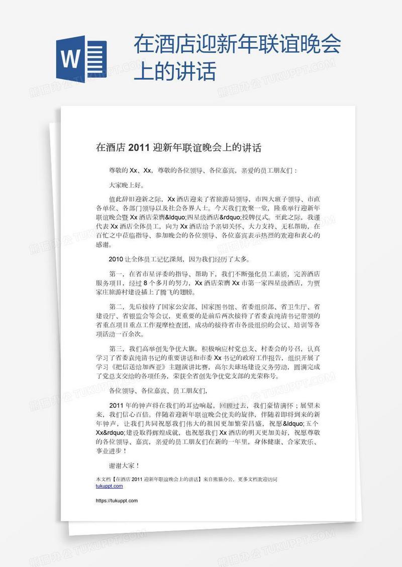 本作品为在酒店迎新年联谊晚会上的讲话, 编号:016qo42l29, 格式为 docx, 大小1 MB, 本作品下载后,先解压,解压之后用推荐软件 Word(2010) 打开, 然后进行编辑功能。