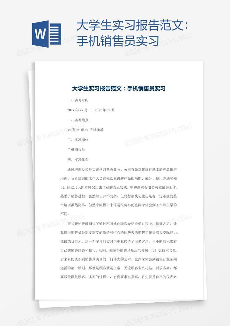 本作品为大学生实习报告范文:手机销售员实习, 编号:016qo6p2w9, 格式为 docx, 大小1 MB, 本作品下载后,先解压,解压之后用推荐软件 Word(2010) 打开, 然后进行编辑功能。