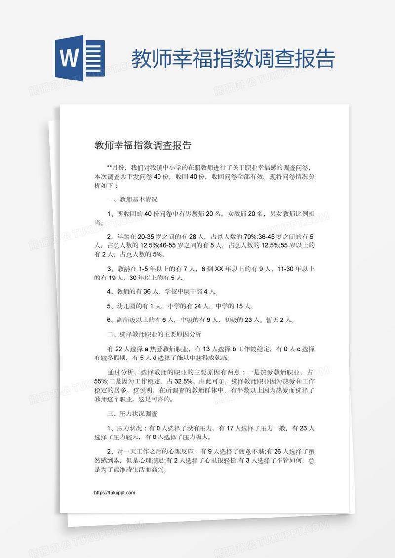 本作品为教师幸福指数调查报告, 编号:016qo76vw9, 格式为 docx, 大小1 MB, 本作品下载后,先解压,解压之后用推荐软件 Word(2010) 打开, 然后进行编辑功能。