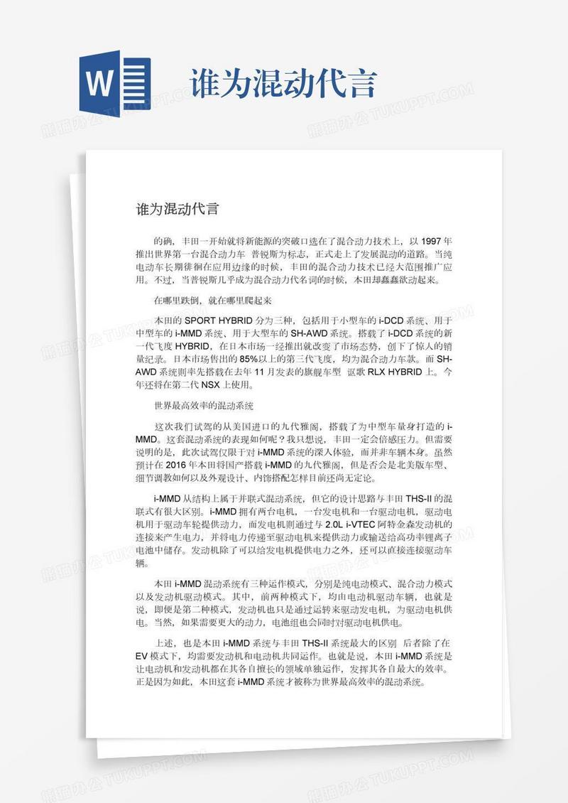 本作品为谁为混动代言, 编号:016qo8jlm9, 格式为 docx, 大小1 MB, 本作品下载后,先解压,解压之后用推荐软件 Word(2010) 打开, 然后进行编辑功能。