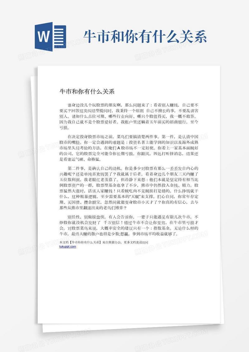 本作品为牛市和你有什么关系, 编号:016qo8jno9, 格式为 docx, 大小1 MB, 本作品下载后,先解压,解压之后用推荐软件 Word(2010) 打开, 然后进行编辑功能。