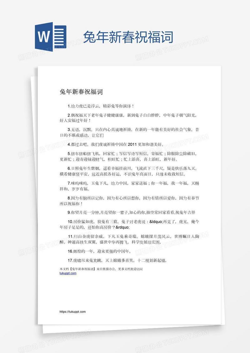 本作品为兔年新春祝福词, 编号:016qodqko9, 格式为 docx, 大小1 MB, 本作品下载后,先解压,解压之后用推荐软件 Word(2010) 打开, 然后进行编辑功能。