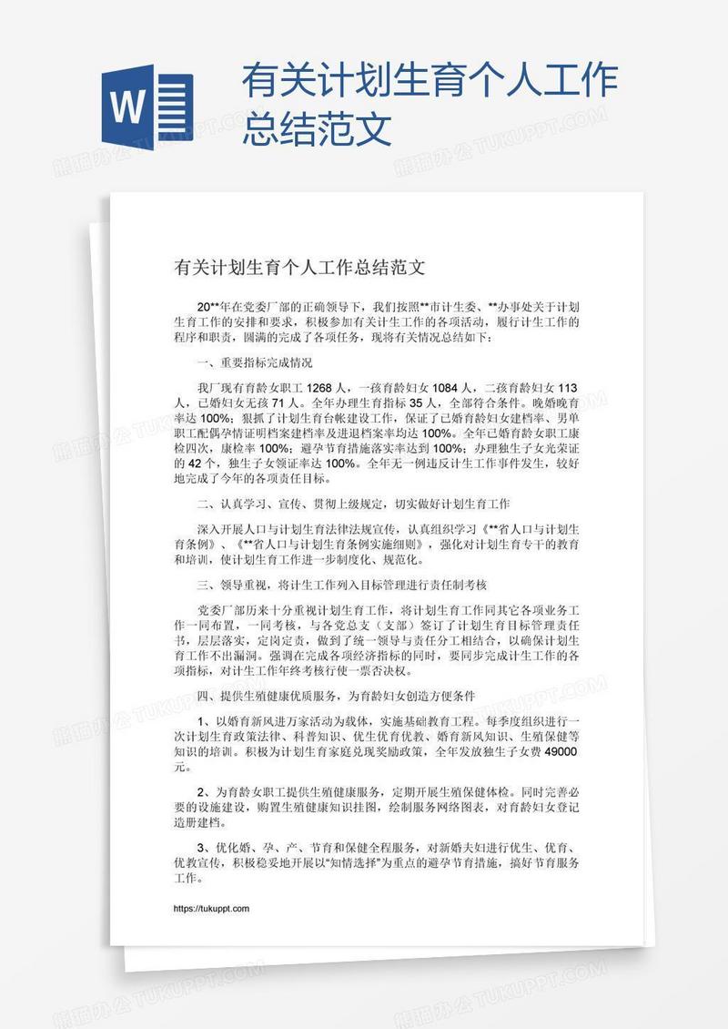 本作品为有关计划生育个人工作总结范文, 编号:016qok8dr9, 格式为 docx, 大小1 MB, 本作品下载后,先解压,解压之后用推荐软件 Word(2010) 打开, 然后进行编辑功能。