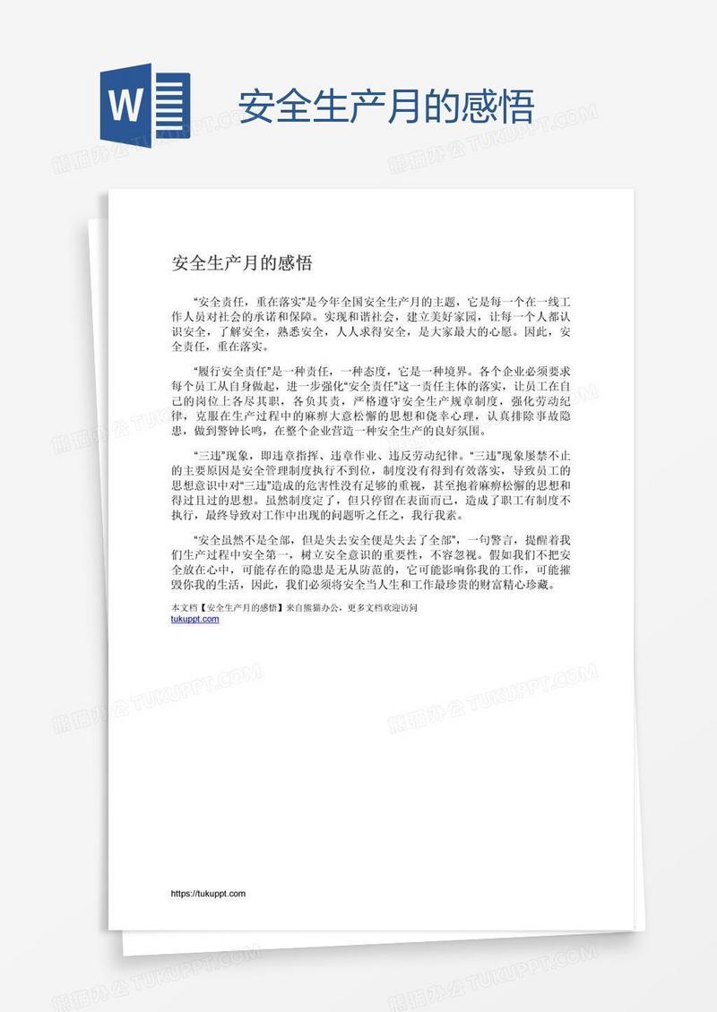 本作品为安全生产月的感悟, 编号:016qom5n29, 格式为 docx, 大小1 MB, 本作品下载后,先解压,解压之后用推荐软件 Word(2010) 打开, 然后进行编辑功能。