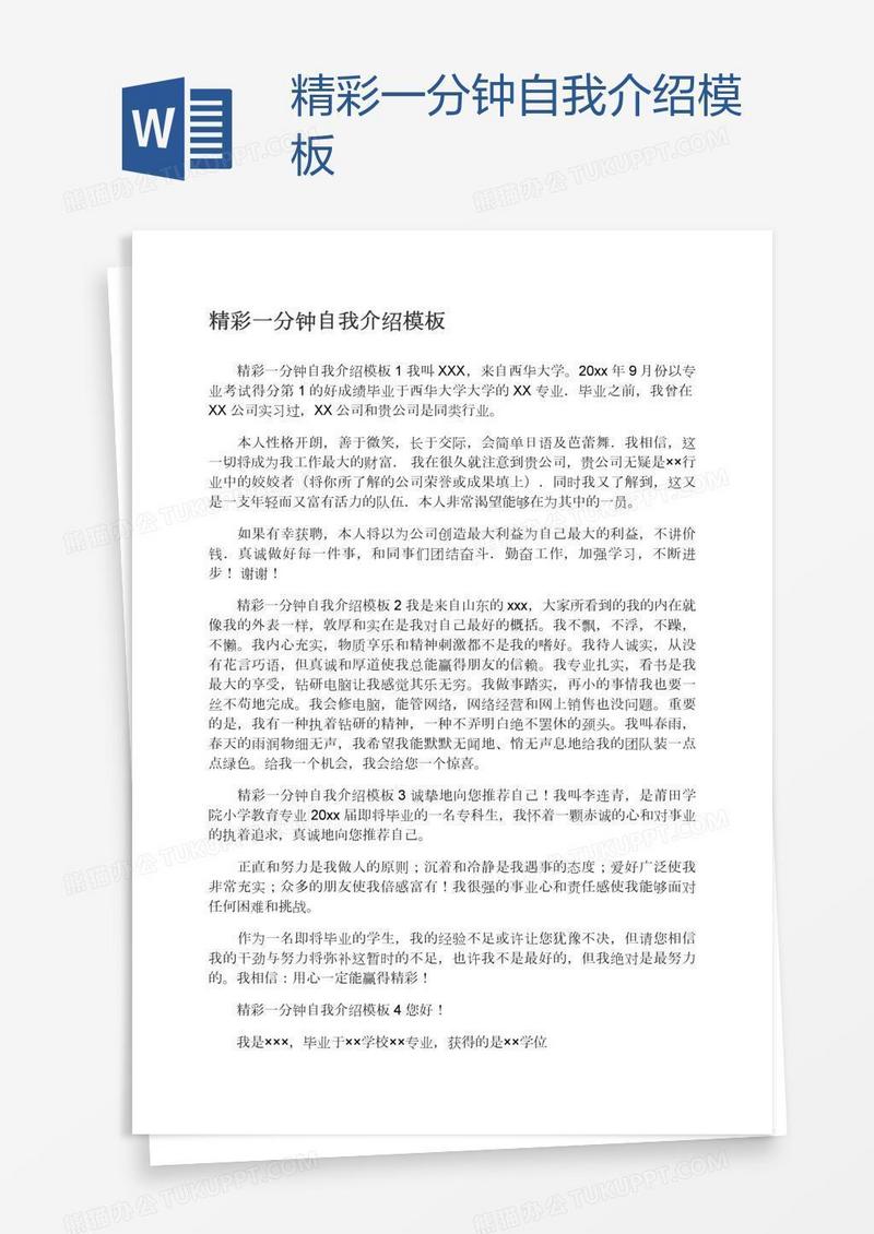 本作品为精彩一分钟自我介绍模板, 编号:016qom6nw9, 格式为 docx, 大小1 MB, 本作品下载后,先解压,解压之后用推荐软件 Word(2010) 打开, 然后进行编辑功能。