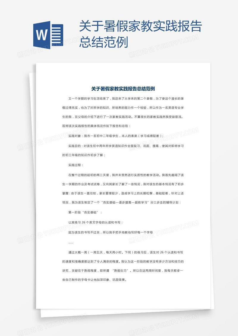 本作品为关于暑假家教实践报告总结范例, 编号:016qoobvm9, 格式为 doc, 大小1 MB, 本作品下载后,先解压,解压之后用推荐软件 Word(2010) 打开, 然后进行编辑功能。