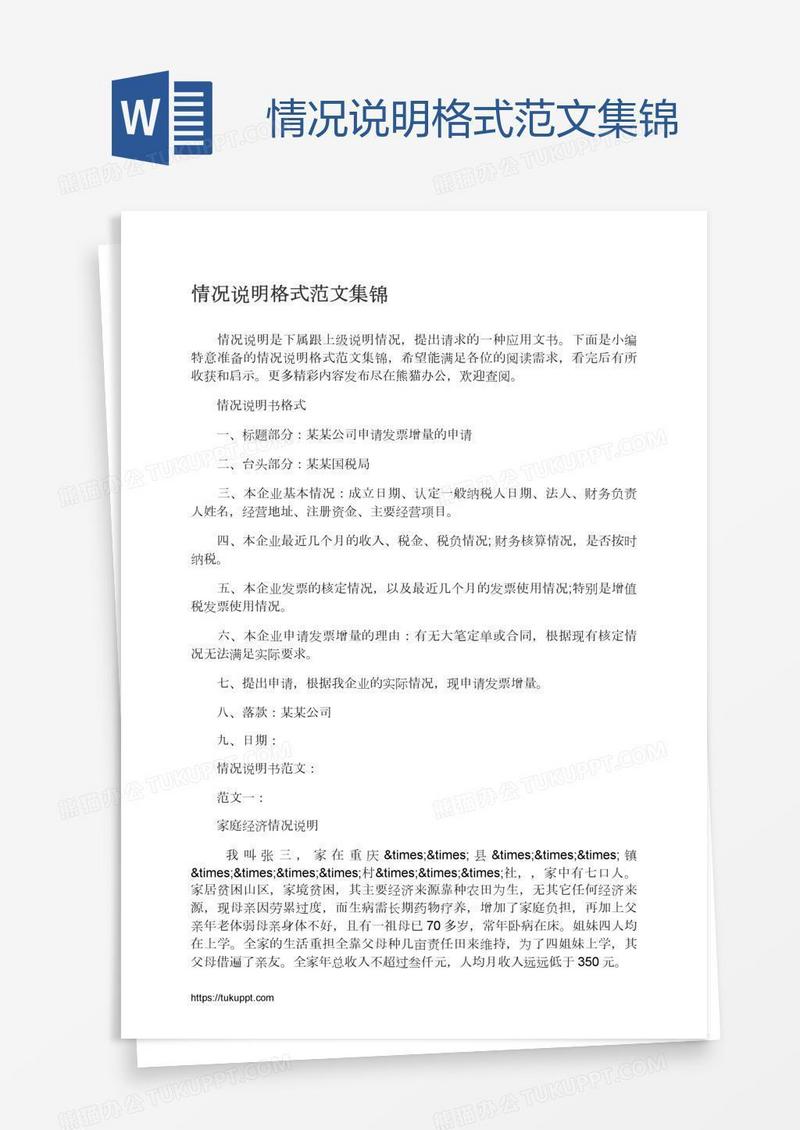 本作品为情况说明格式范文集锦, 编号:016qookre9, 格式为 docx, 大小1 MB, 本作品下载后,先解压,解压之后用推荐软件 Word(2010) 打开, 然后进行编辑功能。