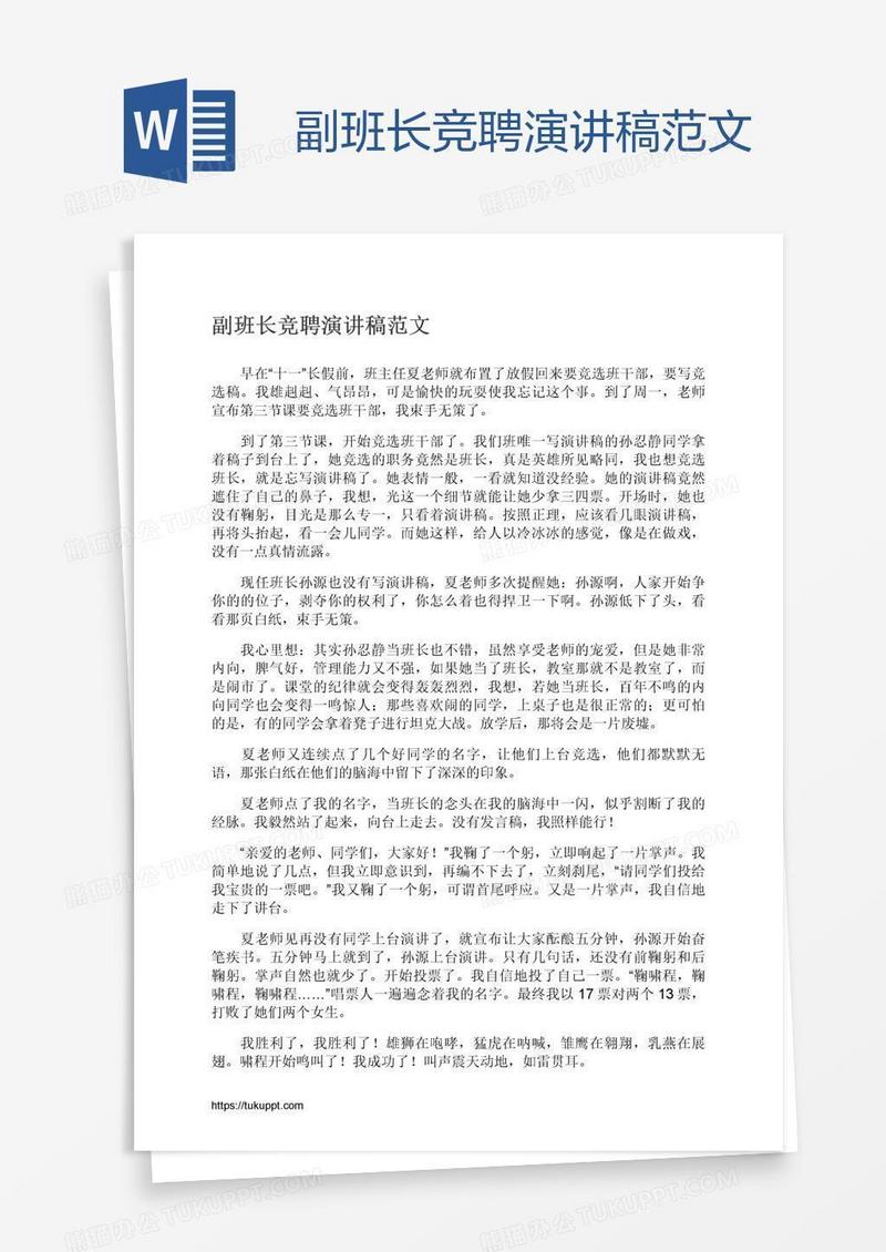 本作品为副班长竞聘演讲稿范文, 编号:016qoqvo29, 格式为 docx, 大小1 MB, 本作品下载后,先解压,解压之后用推荐软件 Word(2010) 打开, 然后进行编辑功能。