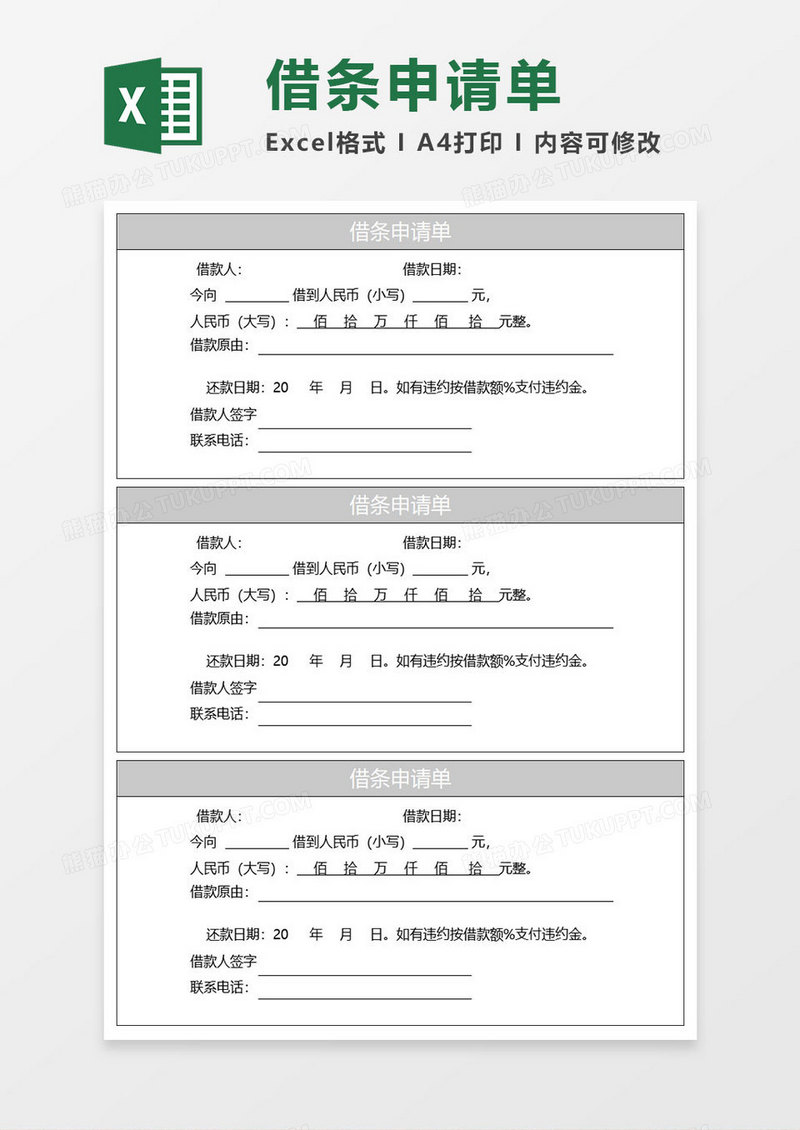 本作品为灰色简约借条申请单, 编号:016qov56o9, 格式为 xlsx, 大小1 MB, 本作品下载后,先解压,解压之后用推荐软件 Excel(2016) 打开, 然后进行编辑功能。