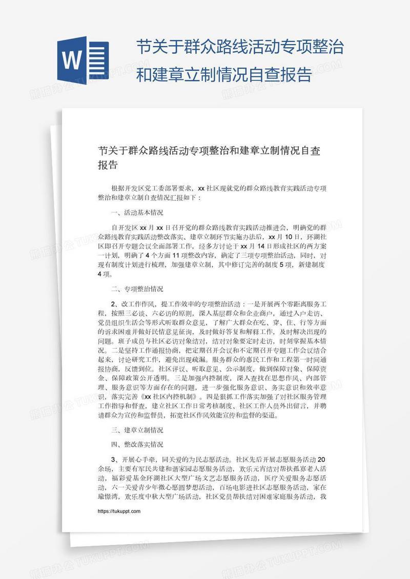 本作品为节关于群众路线活动专项整治和建章立制情况自查报告, 编号:016qoyk629, 格式为 docx, 大小1 MB, 本作品下载后,先解压,解压之后用推荐软件 Word(2010) 打开, 然后进行编辑功能。
