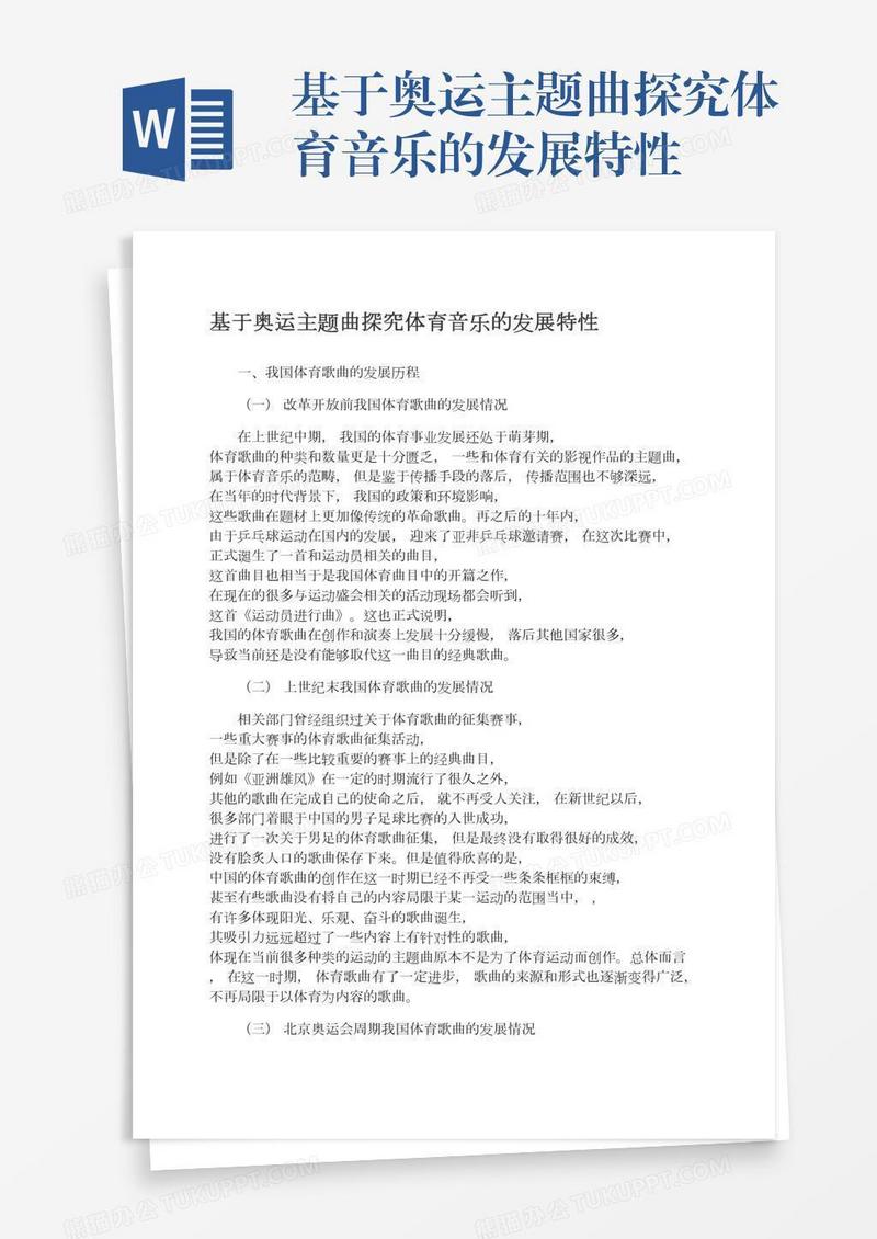 本作品为基于奥运主题曲探究体育音乐的发展特性, 编号:016qyq83o9, 格式为 docx, 大小1 MB, 本作品下载后,先解压,解压之后用推荐软件 Word(2010) 打开, 然后进行编辑功能。
