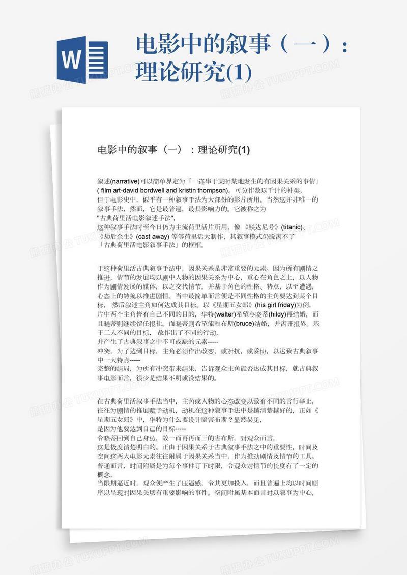 本作品为电影中的叙事(一):理论研究(1), 编号:016qyqvwo9, 格式为 docx, 大小1 MB, 本作品下载后,先解压,解压之后用推荐软件 Word(2010) 打开, 然后进行编辑功能。