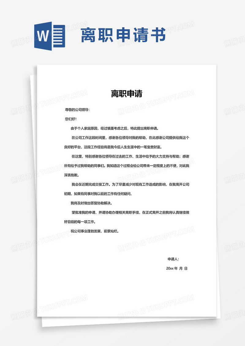 本作品为简单离职申请word模板, 编号:016qyrk629, 格式为 docx, 大小1 MB, 本作品下载后,先解压,解压之后用推荐软件 Word(2019) 打开, 然后进行编辑功能。
