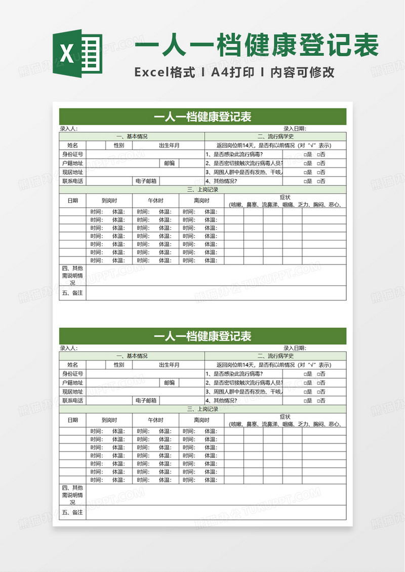 本作品为一人一档健康登记表excel模板, 编号:016qyrlbm9, 格式为 xlsx, 大小1 MB, 本作品下载后,先解压,解压之后用推荐软件 Excel(2016) 打开, 然后进行编辑功能。