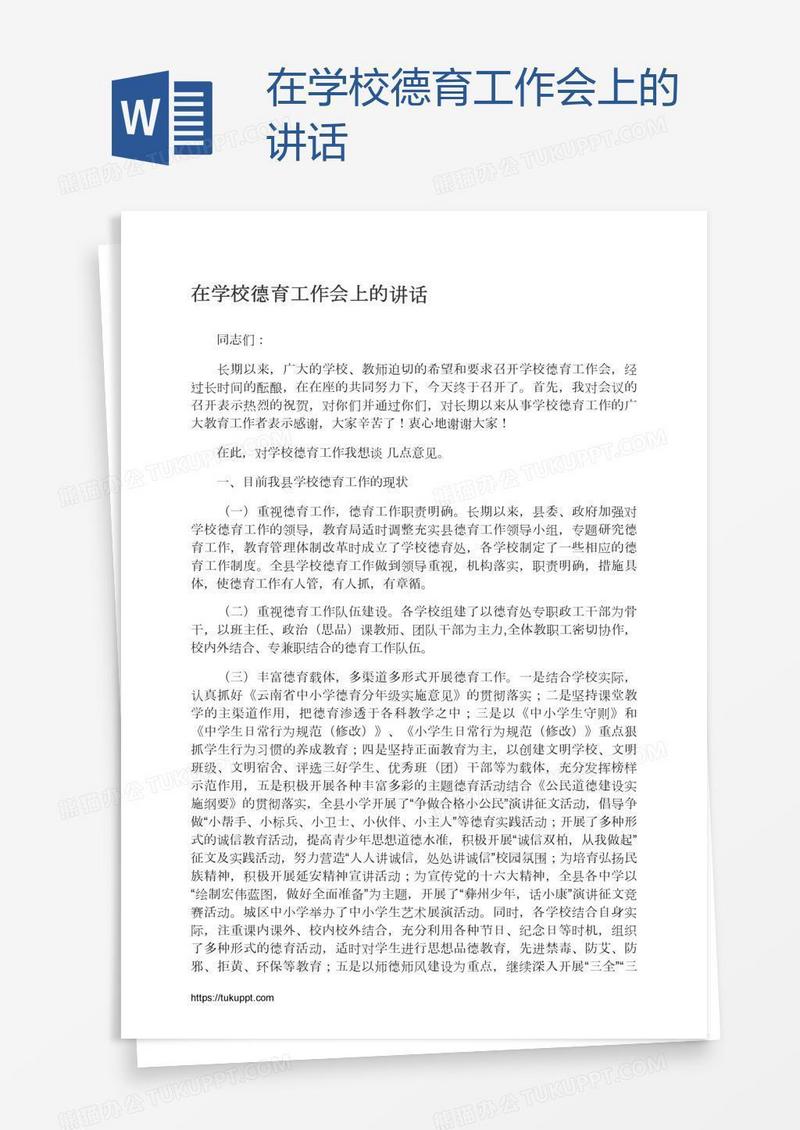 本作品为在学校德育工作会上的讲话, 编号:0ayk3267n9, 格式为 docx, 大小1 MB, 本作品下载后,先解压,解压之后用推荐软件 Word(2010) 打开, 然后进行编辑功能。