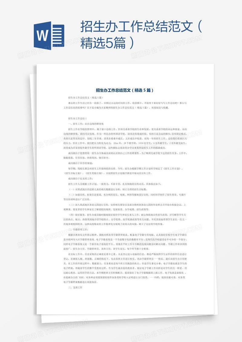本作品为招生办工作总结范文(精选5篇), 编号:0ayk33prm9, 格式为 doc, 大小1 MB, 本作品下载后,先解压,解压之后用推荐软件 Word(2010) 打开, 然后进行编辑功能。
