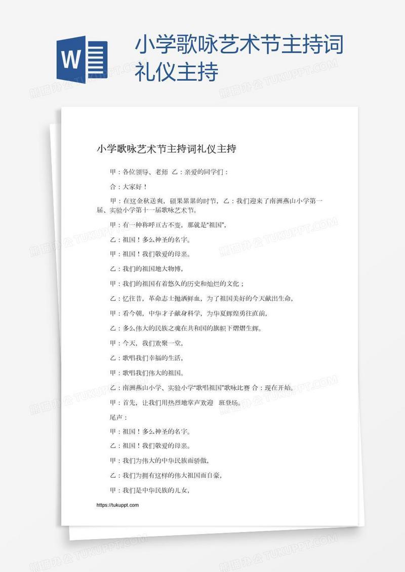 本作品为小学歌咏艺术节主持词礼仪主持, 编号:0ayk34dwm9, 格式为 docx, 大小1 MB, 本作品下载后,先解压,解压之后用推荐软件 Word(2010) 打开, 然后进行编辑功能。