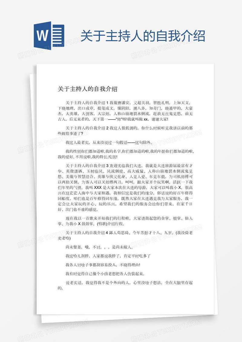 本作品为关于主持人的自我介绍, 编号:0ayk3872k9, 格式为 docx, 大小1 MB, 本作品下载后,先解压,解压之后用推荐软件 Word(2010) 打开, 然后进行编辑功能。