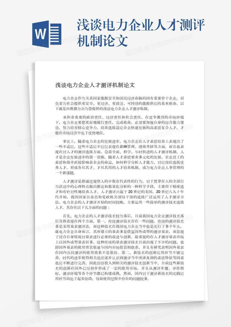 本作品为浅谈电力企业人才测评机制论文, 编号:0ayk3b63n9, 格式为 docx, 大小1 MB, 本作品下载后,先解压,解压之后用推荐软件 Word(2010) 打开, 然后进行编辑功能。