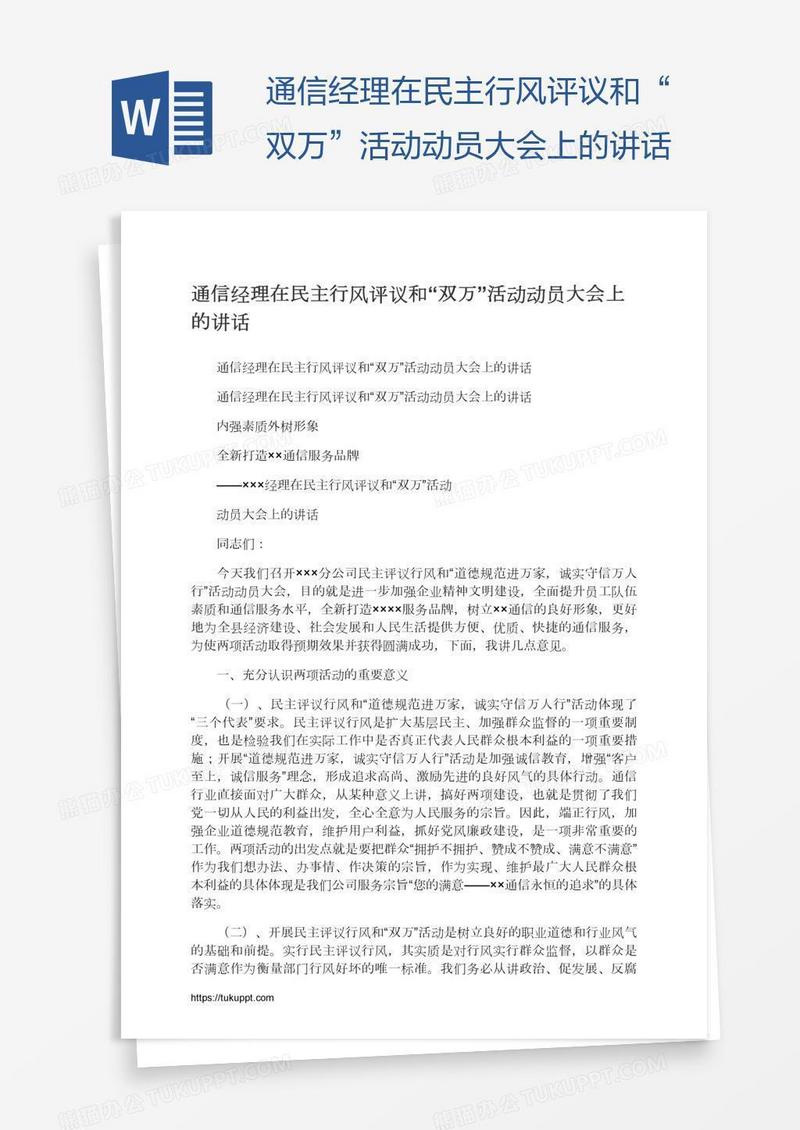 本作品为通信经理在民主行风评议和“双万”活动动员大会上的讲话, 编号:0ayk3d05n9, 格式为 docx, 大小1 MB, 本作品下载后,先解压,解压之后用推荐软件 Word(2010) 打开, 然后进行编辑功能。