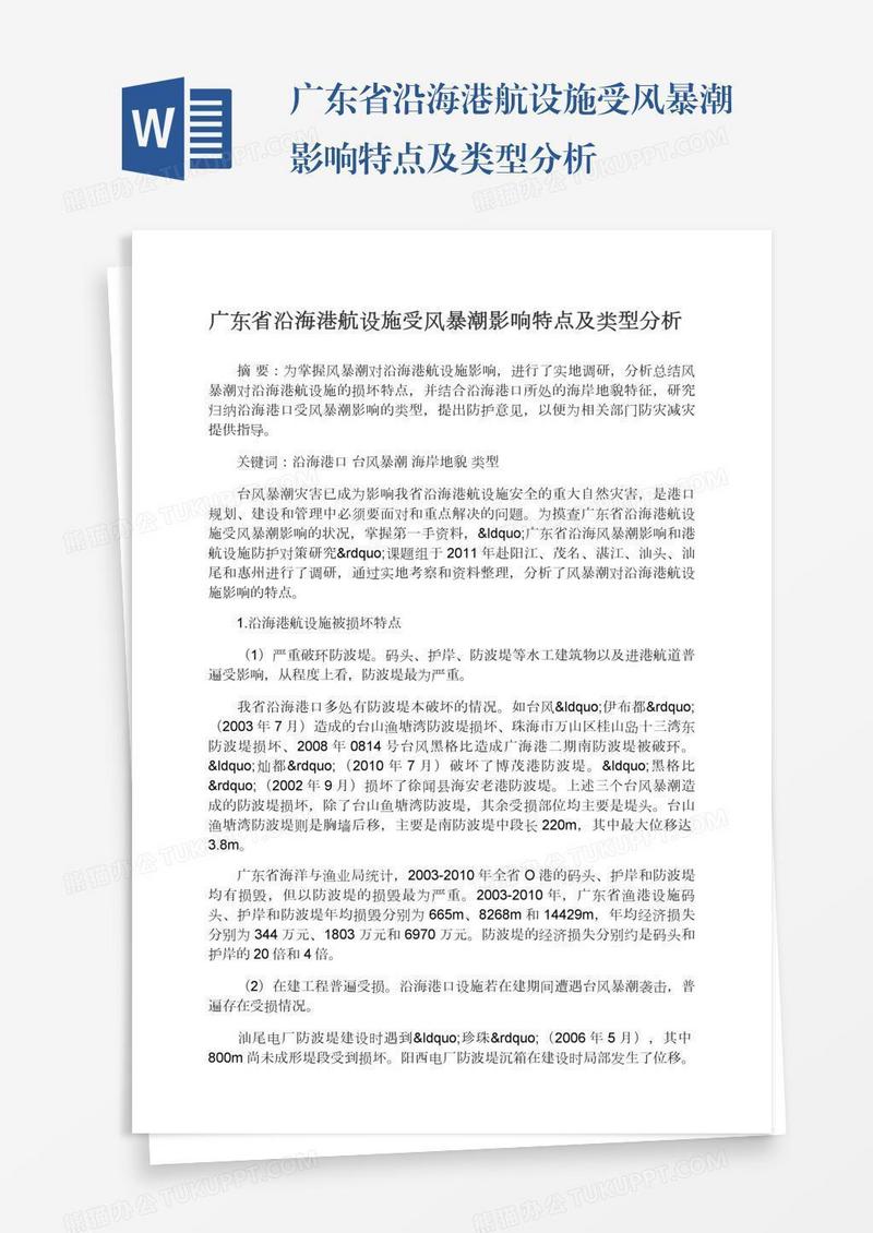 本作品为广东省沿海港航设施受风暴潮影响特点及类型分析, 编号:0ayk3mqod9, 格式为 docx, 大小1 MB, 本作品下载后,先解压,解压之后用推荐软件 Word(2010) 打开, 然后进行编辑功能。