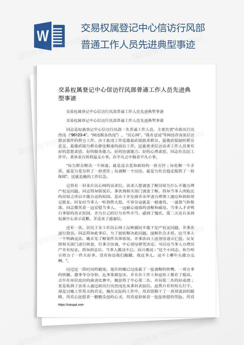 本作品为交易权属登记中心信访行风部普通工作人员先进典型事迹, 编号:0ayk3o0vm9, 格式为 docx, 大小1 MB, 本作品下载后,先解压,解压之后用推荐软件 Word(2010) 打开, 然后进行编辑功能。
