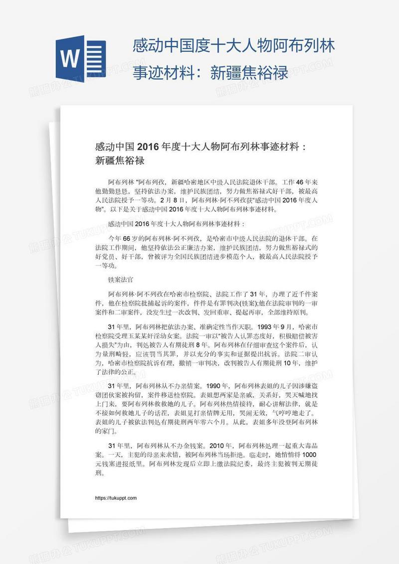 本作品为感动中国度十大人物阿布列林事迹材料:新疆焦裕禄, 编号:0ayk3p7gk9, 格式为 docx, 大小1 MB, 本作品下载后,先解压,解压之后用推荐软件 Word(2010) 打开, 然后进行编辑功能。