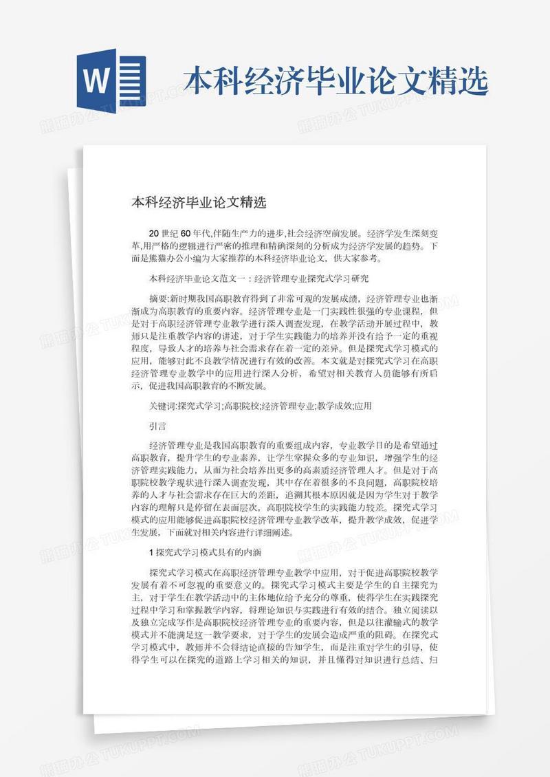 本作品为本科经济毕业论文精选, 编号:0ayk3qy3d9, 格式为 docx, 大小1 MB, 本作品下载后,先解压,解压之后用推荐软件 Word(2010) 打开, 然后进行编辑功能。
