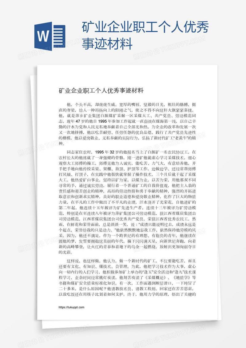本作品为矿业企业职工个人优秀事迹材料, 编号:0ayk3w3rl9, 格式为 docx, 大小1 MB, 本作品下载后,先解压,解压之后用推荐软件 Word(2010) 打开, 然后进行编辑功能。