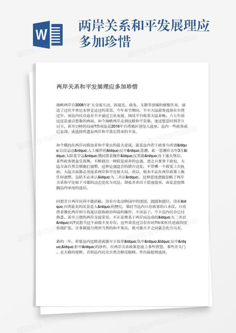 本作品为两岸关系和平发展理应多加珍惜, 编号:0aykn3bwl9, 格式为 docx, 大小1 MB, 本作品下载后,先解压,解压之后用推荐软件 Word(2010) 打开, 然后进行编辑功能。