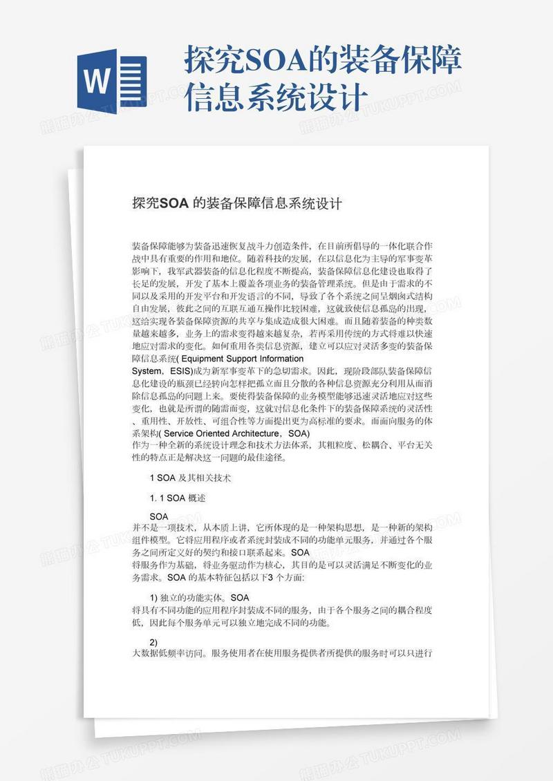 本作品为探究SOA的装备保障信息系统设计, 编号:0ayknk57n9, 格式为 docx, 大小1 MB, 本作品下载后,先解压,解压之后用推荐软件 Word(2010) 打开, 然后进行编辑功能。