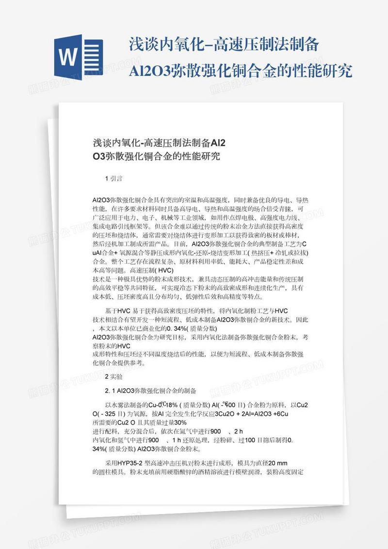 本作品为浅谈内氧化-高速压制法制备Al2O3弥散强化铜合金的性能研究, 编号:0ayknn8wm9, 格式为 docx, 大小1 MB, 本作品下载后,先解压,解压之后用推荐软件 Word(2010) 打开, 然后进行编辑功能。