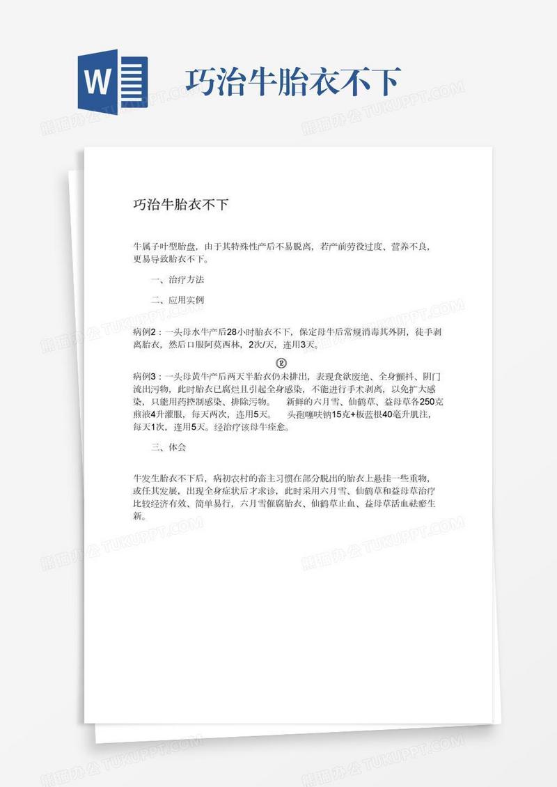 本作品为巧治牛胎衣不下, 编号:0ayknnm3l9, 格式为 docx, 大小1 MB, 本作品下载后,先解压,解压之后用推荐软件 Word(2010) 打开, 然后进行编辑功能。