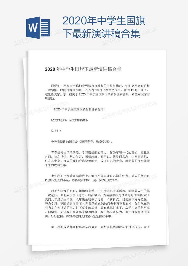 本作品为2020年中学生国旗下最新演讲稿合集, 编号:0aykp004l9, 格式为 docx, 大小1 MB, 本作品下载后,先解压,解压之后用推荐软件 Word(2010) 打开, 然后进行编辑功能。