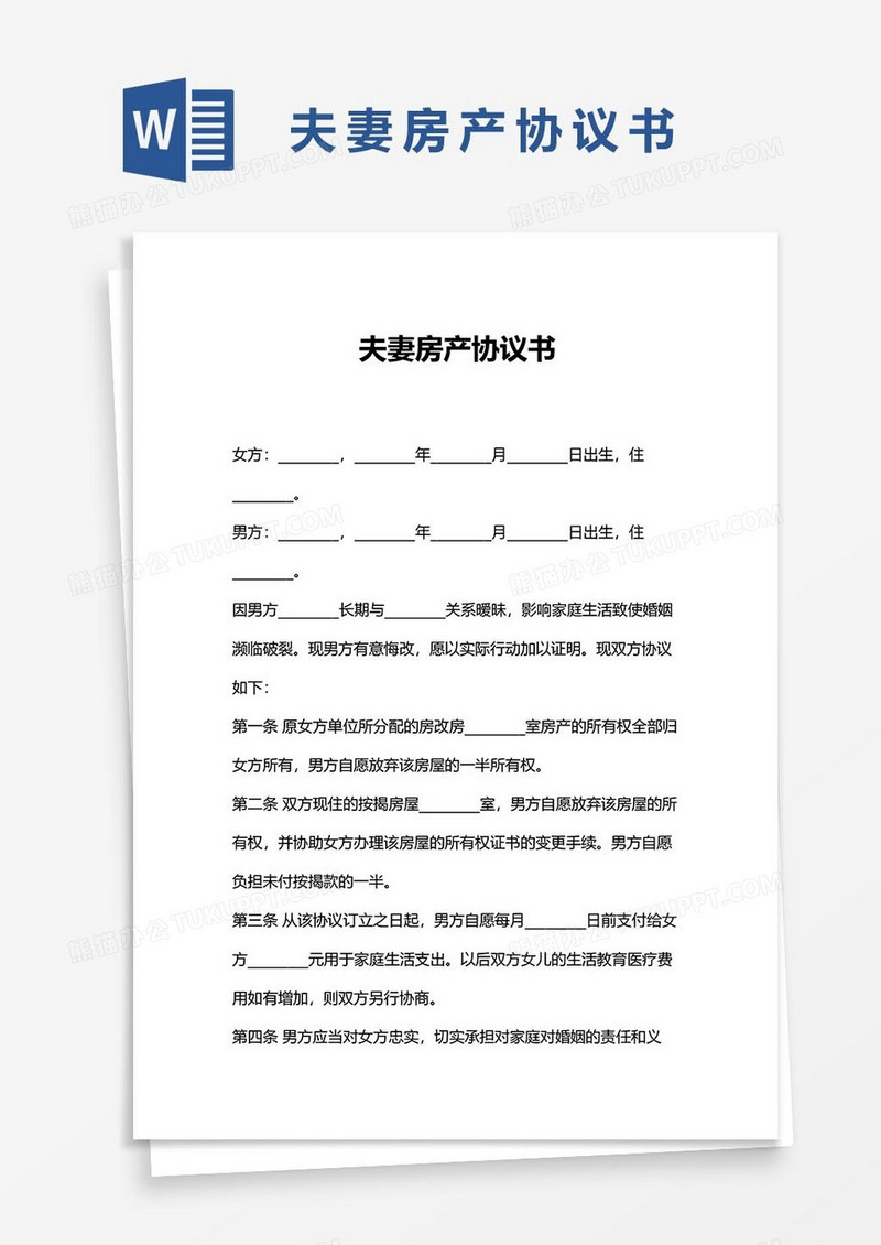 本作品为夫妻房产协议word模板, 编号:0aykp7op79, 格式为 docx, 大小1 MB, 本作品下载后,先解压,解压之后用推荐软件 Word(2013) 打开, 然后进行编辑功能。