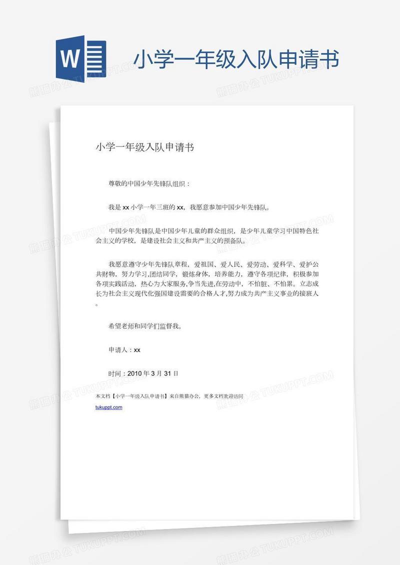 本作品为小学一年级入队申请书, 编号:0aykpmvy79, 格式为 docx, 大小1 MB, 本作品下载后,先解压,解压之后用推荐软件 Word(2010) 打开, 然后进行编辑功能。