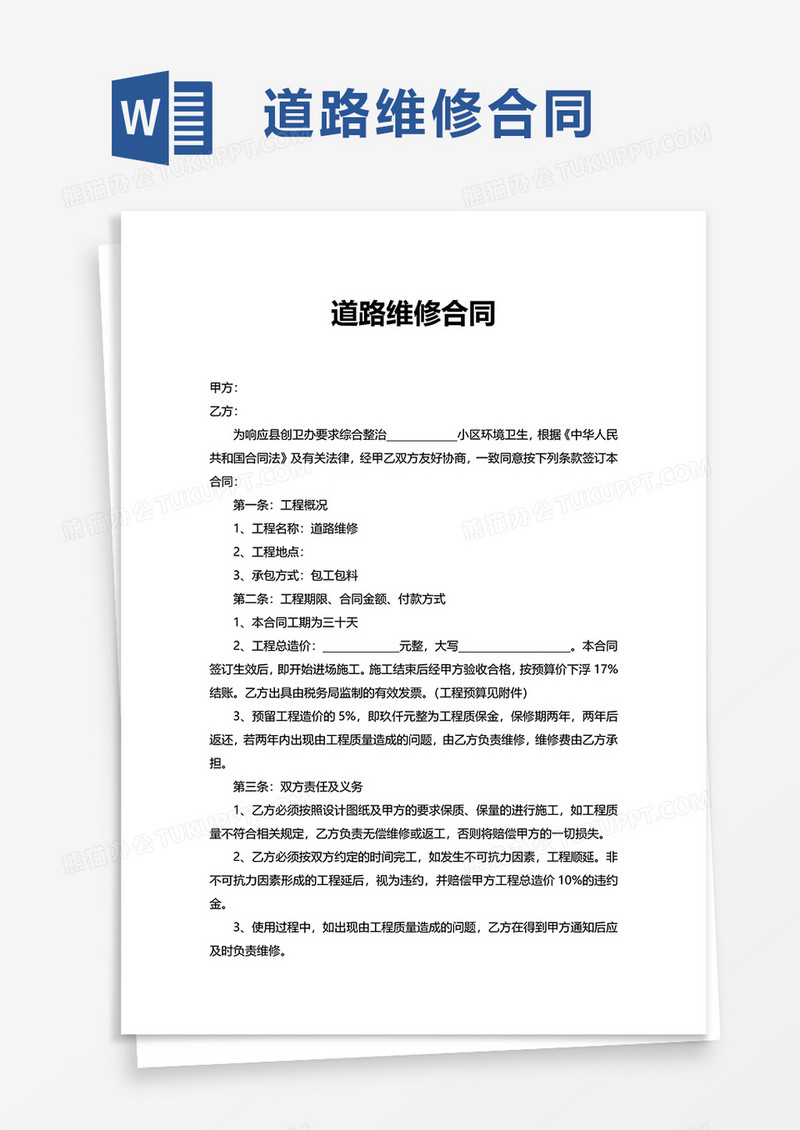 本作品为道路维修合同word模板, 编号:313e37g5p9, 格式为 docx, 大小1 MB, 本作品下载后,先解压,解压之后用推荐软件 Word(2019) 打开, 然后进行编辑功能。