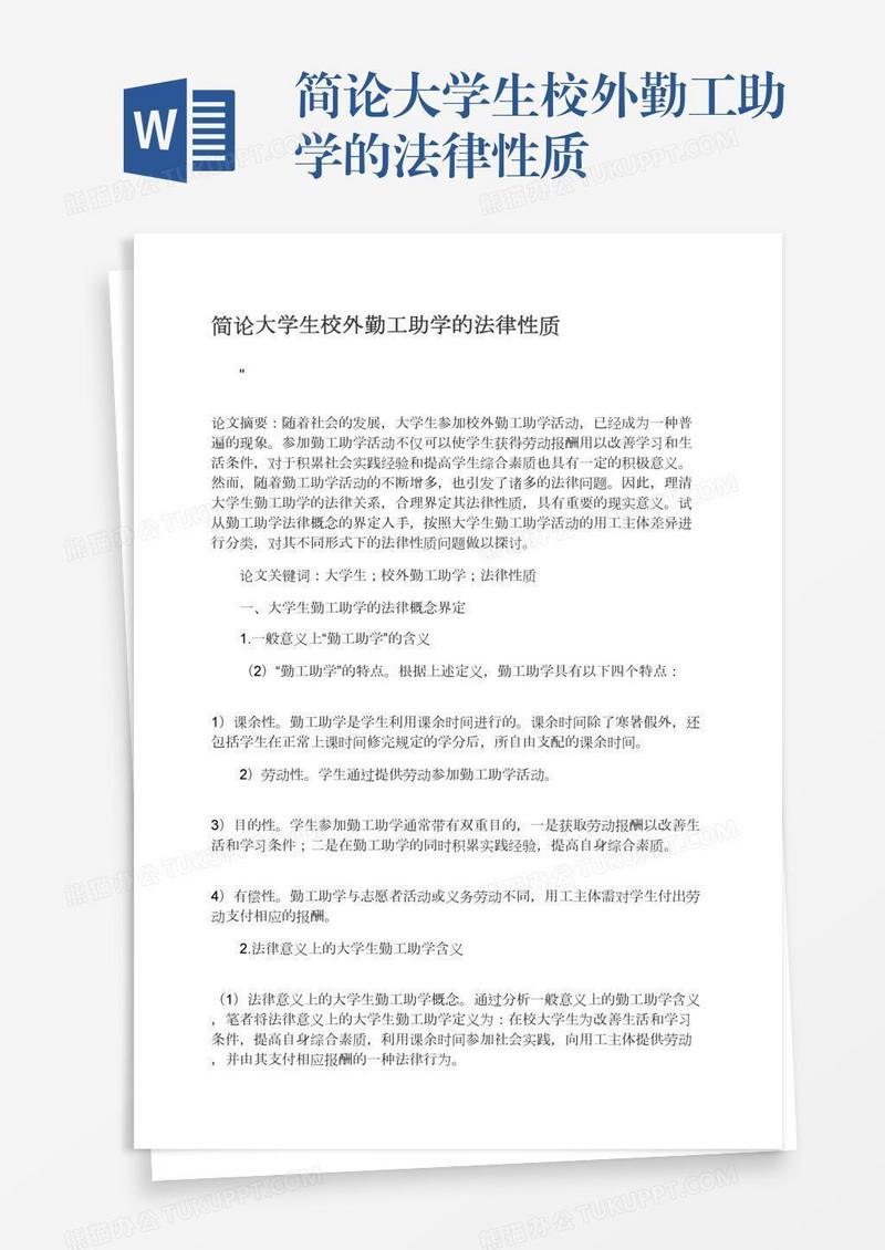 本作品为简论大学生校外勤工助学的法律性质, 编号:313e3rm3p9, 格式为 docx, 大小1 MB, 本作品下载后,先解压,解压之后用推荐软件 Word(2010) 打开, 然后进行编辑功能。