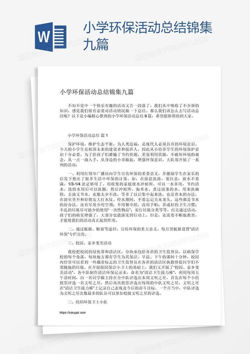 本作品为小学环保活动总结锦集九篇, 编号:313eb432o9, 格式为 docx, 大小1 MB, 本作品下载后,先解压,解压之后用推荐软件 Word(2010) 打开, 然后进行编辑功能。