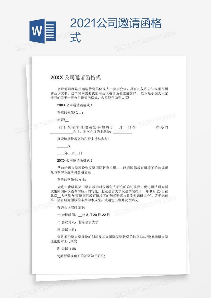 本作品为2021公司邀请函格式, 编号:313eb8glr9, 格式为 docx, 大小1 MB, 本作品下载后,先解压,解压之后用推荐软件 Word(2010) 打开, 然后进行编辑功能。