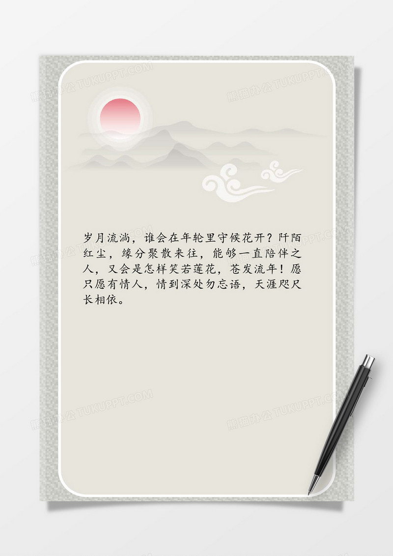 本作品为远山落日中国风word信纸模板, 编号:313ebgo0r9, 格式为 docx, 大小1 MB, 本作品下载后,先解压,解压之后用推荐软件 Word(2016) 打开, 然后进行编辑功能。