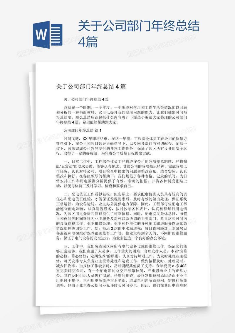 本作品为关于公司部门年终总结4篇, 编号:313ebp7jo9, 格式为 docx, 大小1 MB, 本作品下载后,先解压,解压之后用推荐软件 Word(2010) 打开, 然后进行编辑功能。