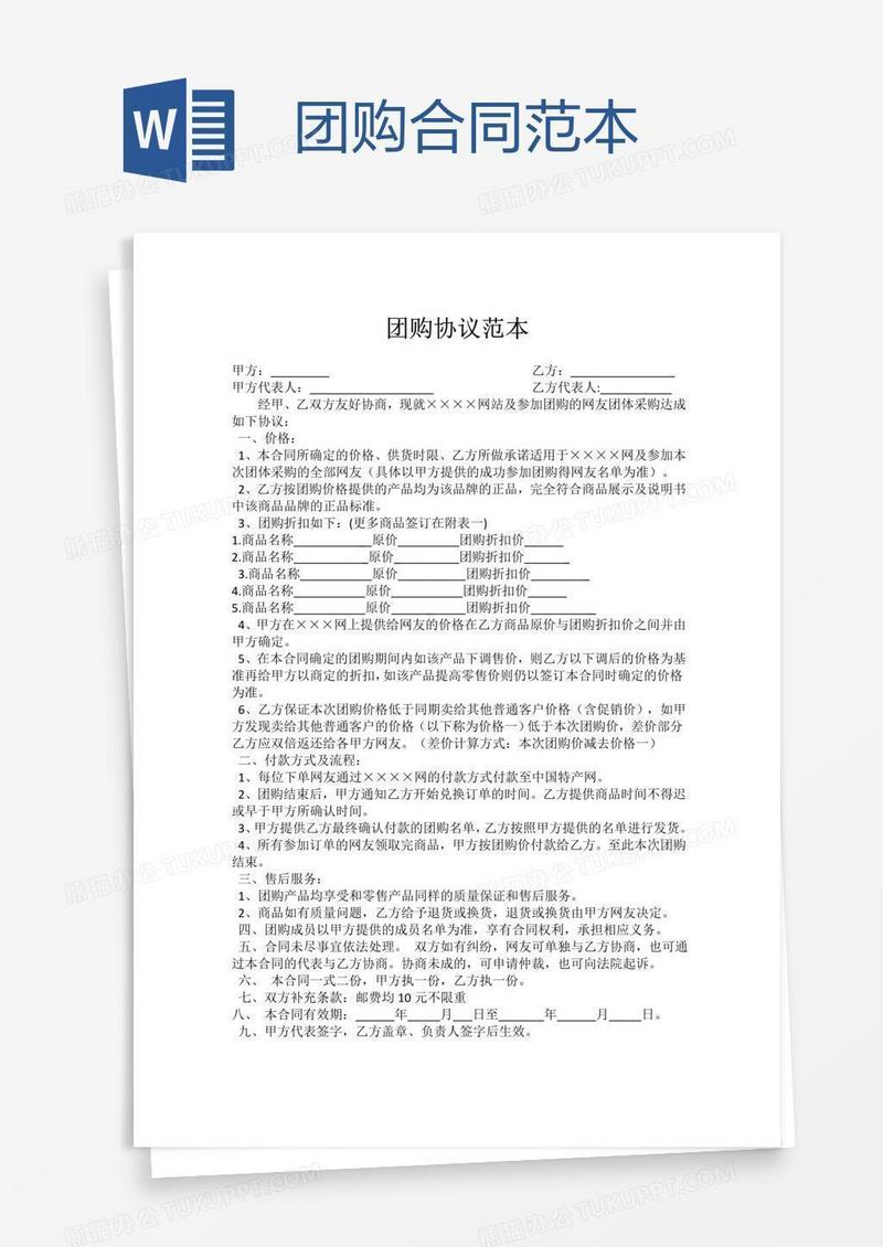 本作品为团购合同范本, 编号:313eby2bp9, 格式为 doc, 大小1 MB, 本作品下载后,先解压,解压之后用推荐软件 Word(2010) 打开, 然后进行编辑功能。