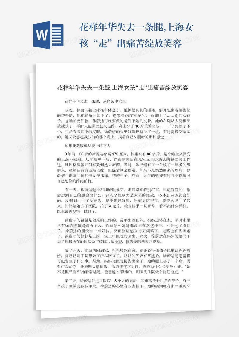 本作品为花样年华失去一条腿,上海女孩“走”出痛苦绽放笑容, 编号:313ek4jrr9, 格式为 docx, 大小1 MB, 本作品下载后,先解压,解压之后用推荐软件 Word(2010) 打开, 然后进行编辑功能。