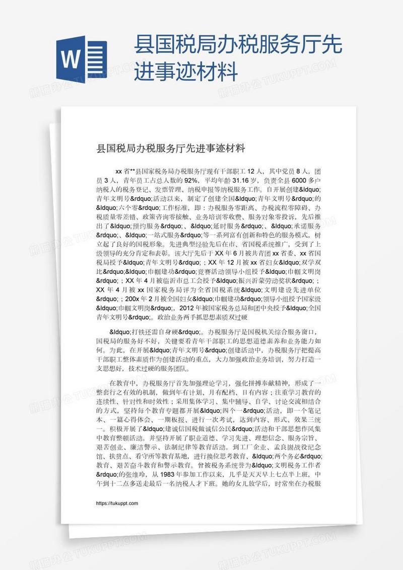 本作品为县国税局办税服务厅先进事迹材料, 编号:313ek6gk69, 格式为 docx, 大小1 MB, 本作品下载后,先解压,解压之后用推荐软件 Word(2010) 打开, 然后进行编辑功能。