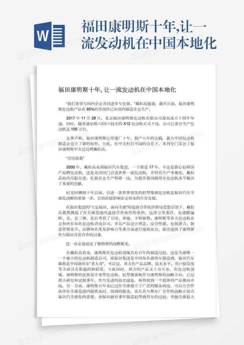 本作品为福田康明斯十年,让一流发动机在中国本地化, 编号:313ekd6dr9, 格式为 docx, 大小1 MB, 本作品下载后,先解压,解压之后用推荐软件 Word(2010) 打开, 然后进行编辑功能。