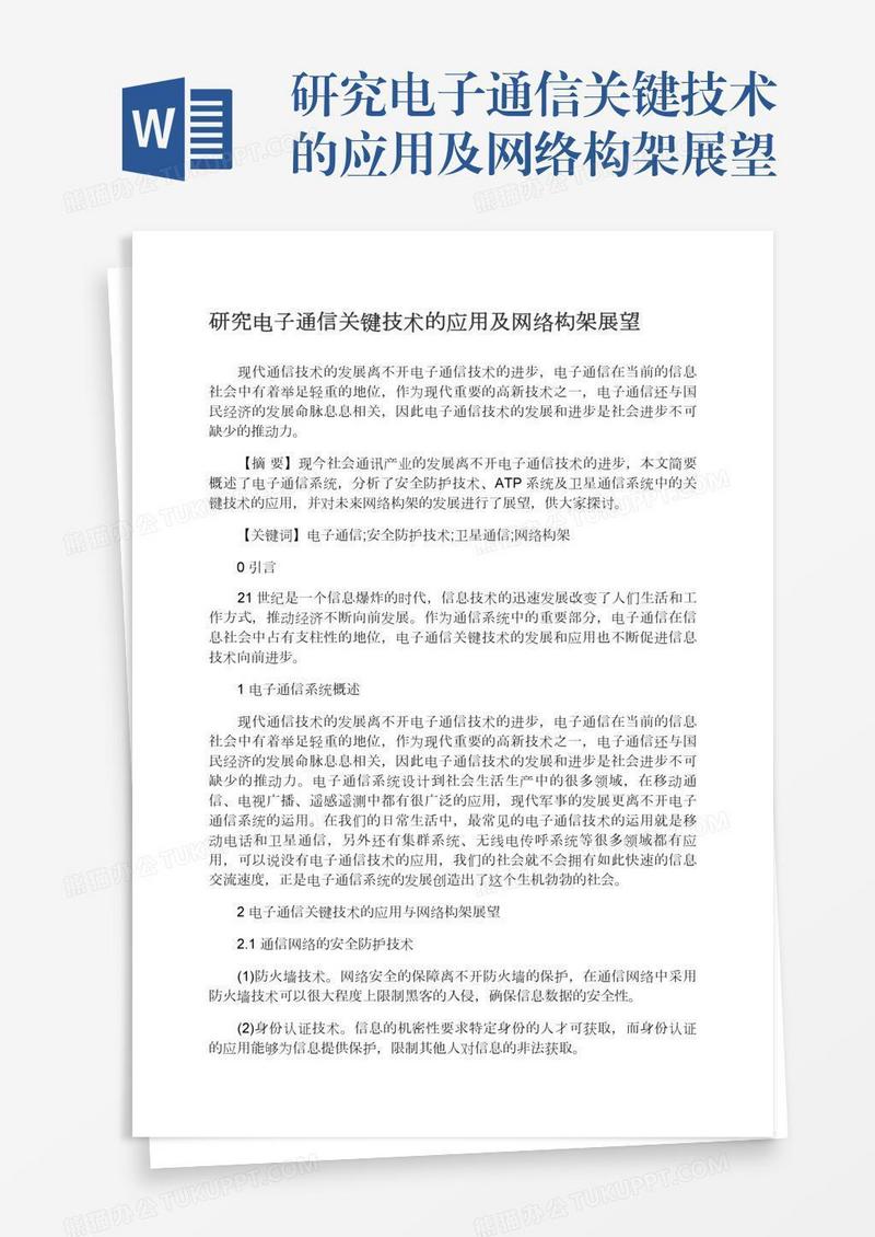 本作品为研究电子通信关键技术的应用及网络构架展望, 编号:313ekdj4o9, 格式为 docx, 大小1 MB, 本作品下载后,先解压,解压之后用推荐软件 Word(2010) 打开, 然后进行编辑功能。